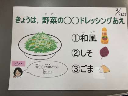 今日のクイズは「ドレッシングあえ」からです。答えは2:しそ でした。