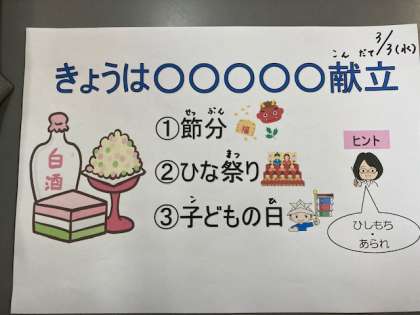 今日の給食カレンダーは「ひなまつり」についてでした。