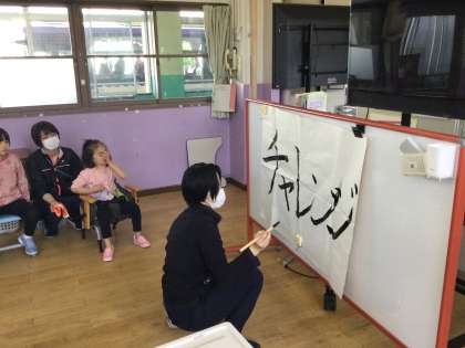 最初に学部長や学年主任の先生からのメッセージを聞いて,3年生のみんなで一年間がんばる思いを強くしました。その後,改めてクラス発表をして,学年目標を紹介!!指導者が筆を持って前に立つと,みんな興味津々で見ていました。学年目標の『チャレンジ10(テン)』を書き始めると,一筆一筆書く毎に集中して見入っていました。その後,みんなで「チャレンジテーーーン!!」と掛け声をかけ心を一つにしました。最後には,お楽しみで自立活動室で遊びました。