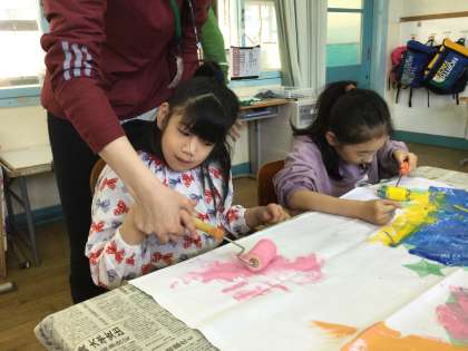 学級旗にも夢中で絵の具を塗る4年生のみんなでした。