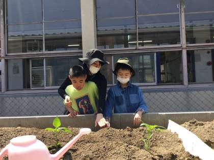 畑に行き、ピーマンの苗とひまわりの種を植えました。