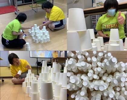 高等部の造形の時間に,紙コップを使って制作活動をしました。どうすればうまく積んでいけるか友達や指導者と相談しながら活動しました。