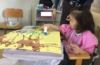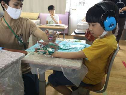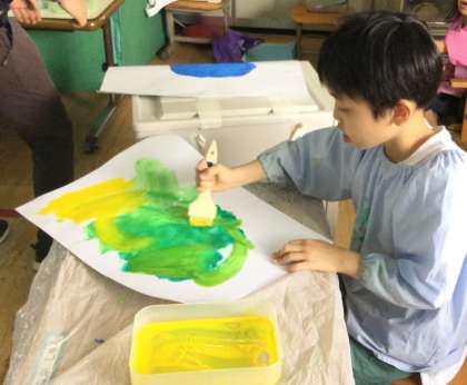 水のりや綿棒、塩など様々な材料を使って描いていきました。四つ切の大きさの画用紙いっぱいに,夢が大きく広がりそうな作品ができました。