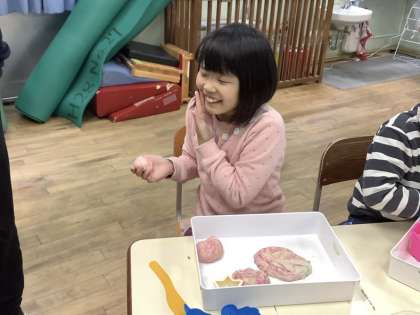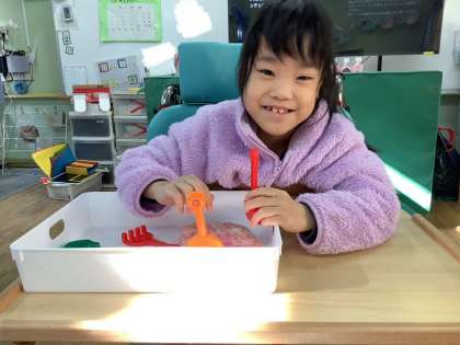 「みんなでやってみよう!」のグループでは,小麦粉粘土を触って感触あそびをしました。丸めたり,触ったりしながら「おもち」「ゆきだるま」「おだんご」などと口にしたり,バケツやスコップを使って活動したりと,それぞれが感触あそびを楽しみました。