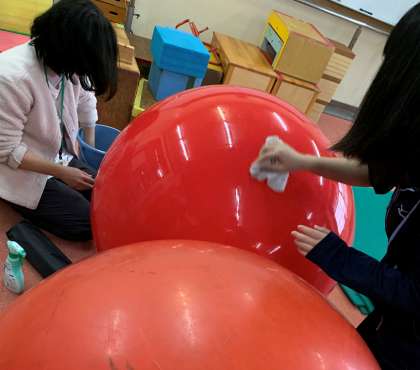 バランスボールも1つずつ,水拭き⇒消毒洗剤⇒水拭きの順でピカピカです!
