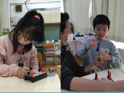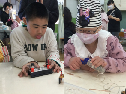 手回し発電機とコンデンサを使った実験では,発電機を回してためた電気で,ライトが光ったのを見て,「わー!」と喜ぶ様子が見られました。