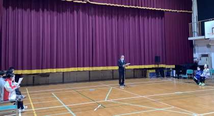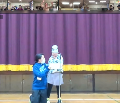 全校児童生徒集会が体育館と各教室をリモートでつないで行われました。