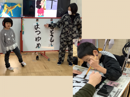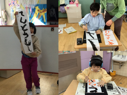 書初めでは,今年大切にしたいことや好きなものなどを書きました。