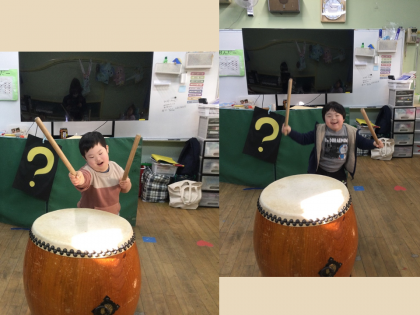 「おんがくあそび」で和太鼓に取り組みました。『たいこのおけいこ』に合わせて,ドン・ドン・カ!!バチや手を使って,叩くことができました。