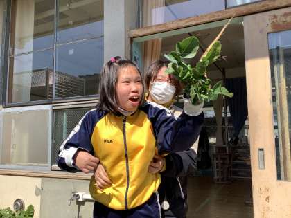 11月に種をまいて,愛情いっぱいで育ててきた大根の収穫を行いました。クラスで順番に水やり係をして成長を見守ってきました。始めはあんなに小さかった大根・・・。