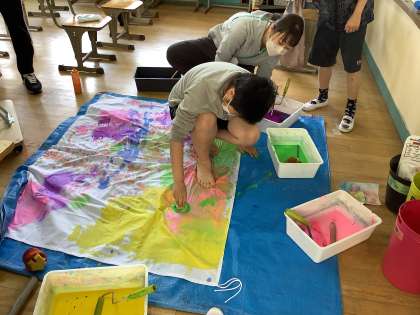5月2日(月) 中学部1年は,学年旗づくりをしました!自分の選んだ色や方法で,思い思いに自分の色を表現しました。友だちが楽しそうに取り組んでいる姿を見て,「こんな方法あるんだ!」「これやってみたい!」と楽しそうに活動する姿が見られました。完成が楽しみです♪