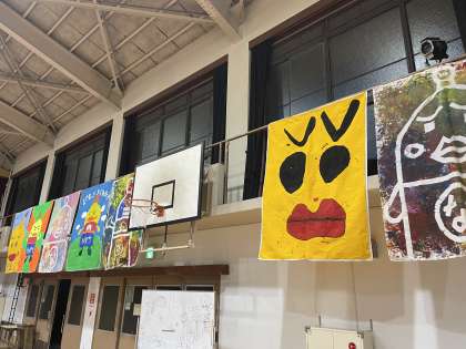呉竹総合支援学校では,令和2年度より納屋町商店街との取組「なやまち×くれたけアートプロジェクト」を開催しています。この度,体育館に昨年度分のタペストリーを展示しています。