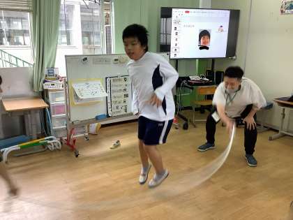 学年全員で取り組んでいる運動の様子です。大繩をタイミングよく跳んだり,縄やハードルをよく見てまたいだりして体を動かしています!