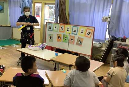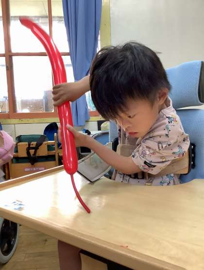 7月の誕生日会のお楽しみコーナーにバルーンツイスター(ICTアドバイザー)の中園先生を招いてバルーンアートをしました! 初めは少し緊張している様子でしたが、中園先生が作っていく姿を見て、みんな一気に興味津々。膨らましたり捻じったり、教えてもらいながら一生懸命頑張る姿が素敵でした。
