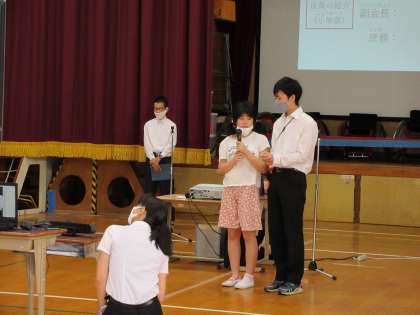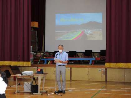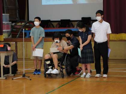 体育館をメイン会場としてリモートで全校児童生徒集会を行いました。校長先生のお話では、4月に言われた今年1年間で達成してほしいこと、「挨拶をする」「人を大切にする」「目標を立てて学習に取り組む」に今日まで取り組むことができたかを振り返りました。また、長い夏休み中、体調管理をすること、チャレンジをすること、思い出をたくさん作ってほしいとのお話もありました。