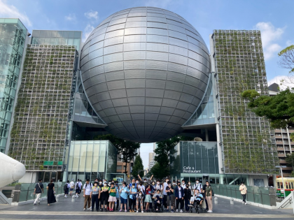 名古屋市立科学館に到着しました。大きな球体を背景に集合写真!