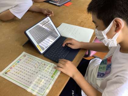 中学部「ICT」ユニットの活動の一部として、ペアでのしりとりやタイピングのタイムアタックで楽しく集中して活動しています。また、タイピングやフリックなど、それぞれの課題に合わせた入力方法で文書を写したり、ポスターを作ったりもしています。