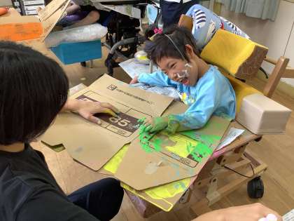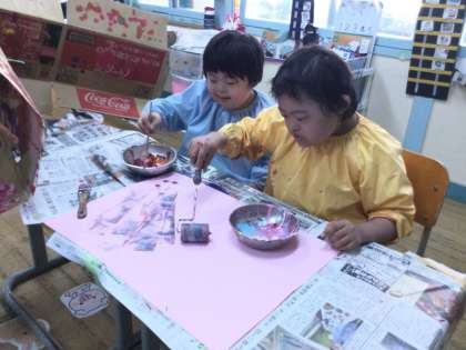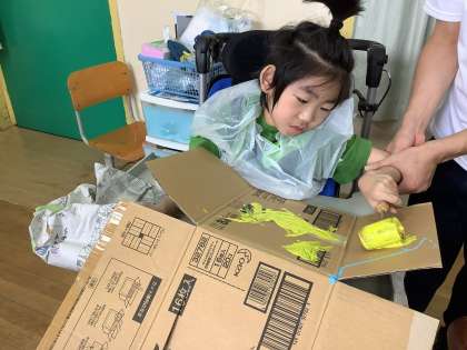 文化の部にむけて、展示作品を制作中です。大きな段ボールや画用紙に思い思いの色を塗っていきます。