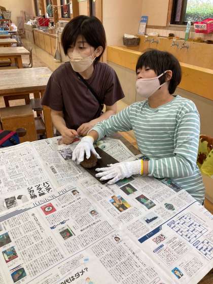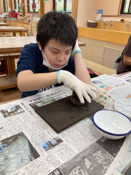 今日の午前の活動は,焼き板です。みんな真剣な表情で頑張っています。
