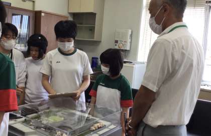 新校舎の模型やイメージ写真を見て説明を受けて生徒たちから「お〜」の歓声が上がっていました。今回教えてもらったことはみんなでポスターにまとめ中央廊下に掲示しています。