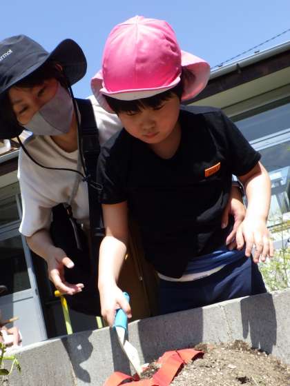 畑の畝に穴を掘る人、堀った穴に苗を入れる人、苗に軽く土をかぶせる人、水やりをする人。みんなで協力し、植えることができました。今から、秋に大きく育ったサツマイモを収穫するのが楽しみです。
