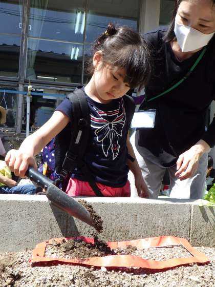「大きくなあれ!大きくなあれ!」と指導者と一緒に声をかけながら、水やりに取り組んでいます。