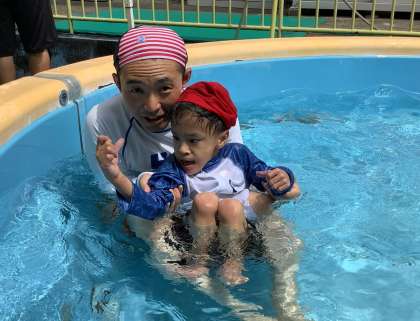 最初は様子をうかがいながら、ゆっくり動いていた子どもたちも、慣れてくると笑顔になり、水をかけ合ったり、バタ足をしたり、顔を水につけてみたりと、とても楽しそうでした。