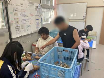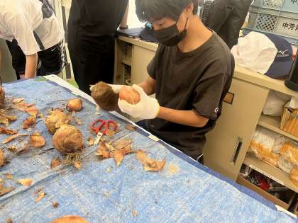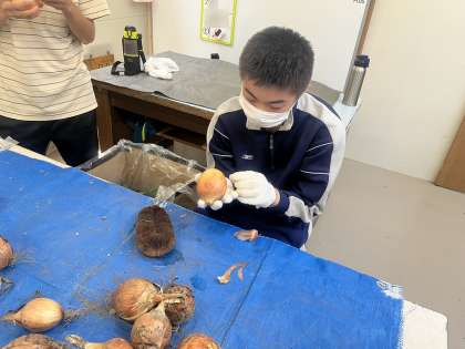 今回行われたのは、環境メンテナンス生徒の農園体験です。農園芸の生徒が玉ねぎの処理の仕方について教えてくれました。