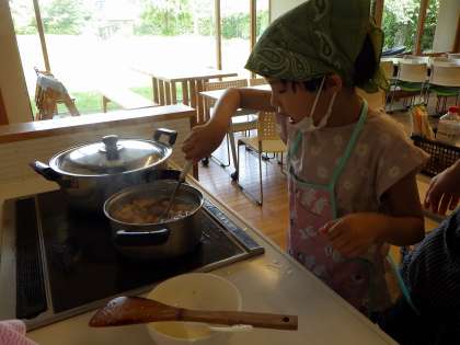 みんなで協力して味噌玉(味噌汁のもと)やカレーライス、ゼリーを作りました。野菜の皮むきや型抜き、ぶんぶんチョッパーを使ってのみじん切り等、それぞれができることを生かして役割を担い、おいしいごはんができました♪