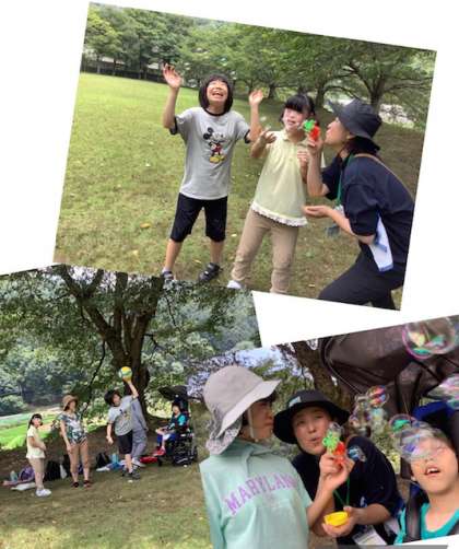 アスレチックや、広場でボールやシャボン玉を使って活動しました。日陰は風もあり、自然を感じることもできました。
