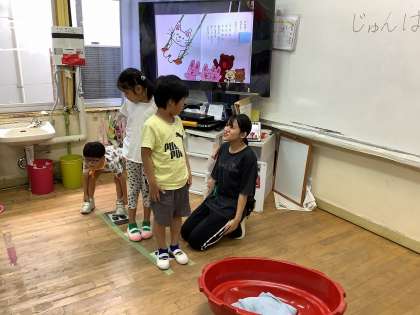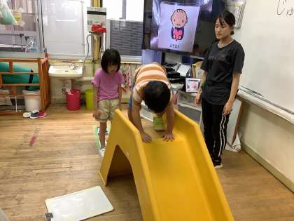 2年生では、「じゅんばん!」を合言葉に、順番を守って滑り台やかめっこ遊びをしました。足型の上に並んだ後も、遊びたい気持ちがあふれて思わず前に行こうとする姿もありましたが、みんなで「じゅんばん!」と合言葉を言うことで、足型の上に並びなおし、順番を守って遊ぶことができました。