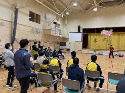 クイズの後は、本日のメインイベント!大道芸人の「たっきゅうさん」によるパフォーマンスを、みんなで見ました。生徒たちの呼びかけに笑顔で登場し、次々にすごい手品やジャグリングを披露してくださいました。
