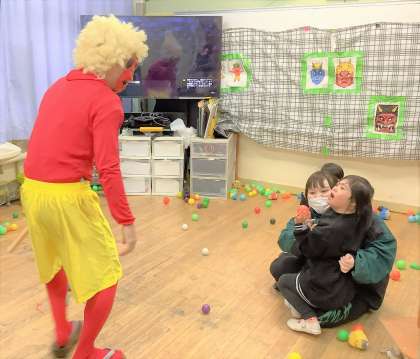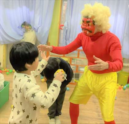 教室に鬼が登場すると、怖がる子もいれば果敢にボールを投げて退治しようとする子もいて、大盛り上がり。
