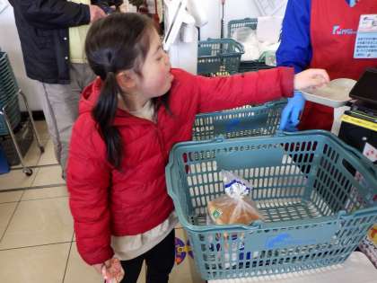 3、4組は万代に買い物学習にいきました。おうちから頼まれた商品を発見すると、「あった!」と嬉しそうな子どもたち。かごに商品を入れ、レジに並び、お金の支払いも事前学習で取り組んだおかげでばっちりでした。