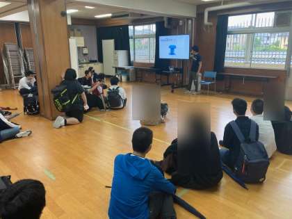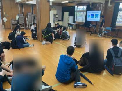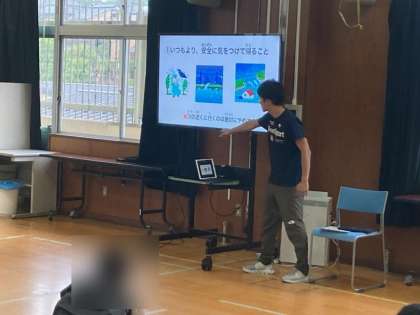 そこで、自主通学生は下校前に多目的教室に集まり、生徒指導主事の先生から、大雨の時の注意事項や帰宅連絡をすること等の話を聞きました