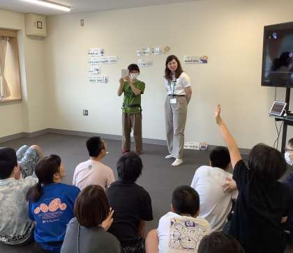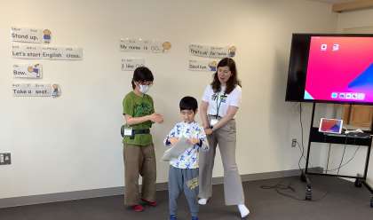自己紹介で、名前や好きなことを英語で発表したり、アルファベットクイズをしたり、「幸せなら手をたたこう」の英語バージョンを踊ったりして、楽しい時間になりました。