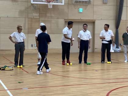 伏見ロータリークラブのみなさんが、11月に予定している本校児童生徒とのボッチャ交流大会に向けて、練習に来られました。みなさんボッチャは初めてのご様子でしたが、本番を楽しみに取り組んでおられました。