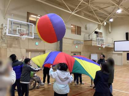 1年生は卓球バレーやボッチャ、エアバルーン。はじめに自己紹介をして打ち解けた後は、一緒に声を掛け合いながら楽しく活動に取り組む様子が見られました。