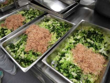 もう一つの写真は,とても色鮮やかだったので,思わず撮った「キャベツと小松菜の土佐酢あえ」の再調理中の写真です。さっぱりとして,暑さも少し和らいだ気分になりました。