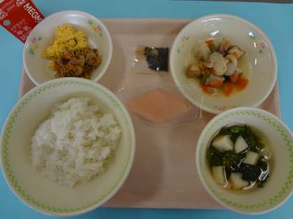ひなまつりは,「子どもたちの健やかな成長と幸せを祈る」行事です。桃の花の季節にあたるので,「桃の節句」とも言われています。給食では,色鮮やかな「ちらしずし」,花のつぼみを食べ,早春の野菜である菜の花の入った「すまし汁」,ひしもちの形をした「三色ゼリー」でお祝いしました。