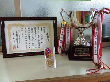 6月15日(日)に「全京都障害者総合スポーツ大会 卓球バレー大会の部」が開催されました。本校の代表として「バンブー∞(エイト)」が出場しました。決勝戦直前には円陣を組み、心をひとつにし、見事、優勝しました。呉竹が優勝したのは14年ぶりの快挙です。
