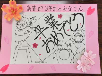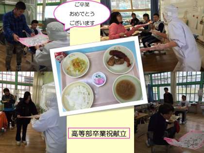 「配膳室からも卒業をお祝いしよう」と,給食配膳員さんが,手作りお祝いポスターを届けに,高等部3年生の教室に訪問するというサプライズもあった給食時間でした。子どもたちからは,「とても豪華で,うれしい給食時間だった」「今日で最後なのはさびしいな」「今までありがとう」と,給食についてもいろいろな思いをはせながら,過ごしていました。