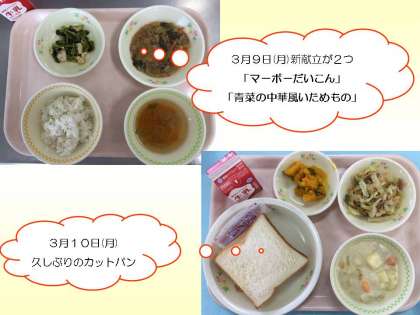 3月の新献立が2つ登場しました。「マーボーだいこん」と「青菜の中華風いためもの」です。