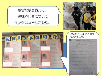 「より楽しく気持ちよく給食時間を過ごすことができるように」と1年間さまざまな活動を行なってきました。11月からは,なかなか話をする機会のない給食配膳員さんのことを知りたいという子ども達の思いから,配膳員さんにインタビューをし,その報告をポスターにまとめたり,全校集会で発表したりしました。活動を通して,給食委員を中心に給食配膳員さんの名前と顔を覚えて,児童生徒から呼びかけるようになってきました。