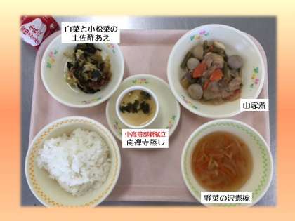 10月13日の献立は,「ごはん・牛乳・山家煮・白菜と小松菜の土佐酢あえ・野菜の沢煮椀・南禅寺蒸し(中高等部)」でした。