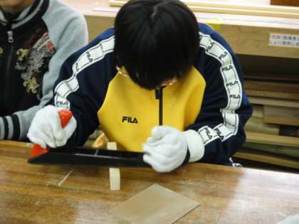 中学部のワークスタディC班は木竹工・メンテナンスの要素を含む活動の中で「はたらく」に迫っていきます。今日は,木竹工の作業として木片をのこぎりで切ったり,木片のやすりがけをしたりしました。