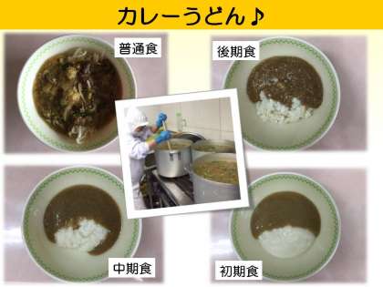 カレーうどんは,特別食もめんと汁を分けて配食し,よりおいしく食べられるように工夫しています。