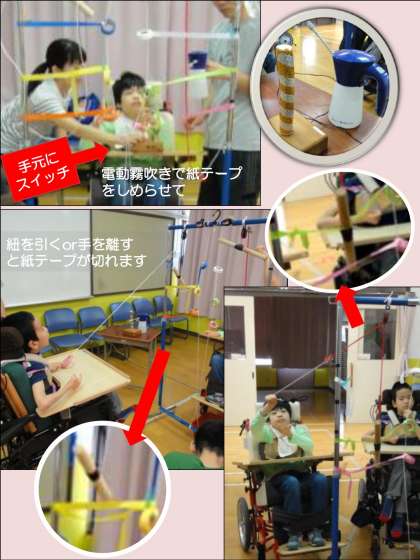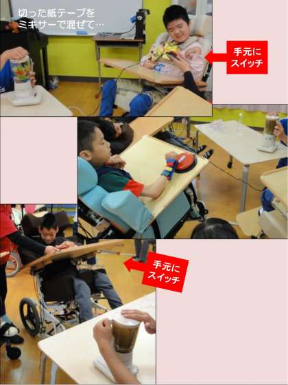 ワークA班では,様々な「できる状況づくり」によって,「はたらく」につながる活動に取り組んでいます。電動霧吹きのビックスイッチを押して,紙テープを湿らせる作業。紐を引く,または紐を持っていた手を離すことで,横に張られた紙テープを切る作業。切った紙テープをミキサーで撹拌する作業。自らスイッチ等を意図的に動かす生徒や,先生からの励ましを受けながら作業する生徒など,実態は様々ですが,皆,生き生きと活動していました。