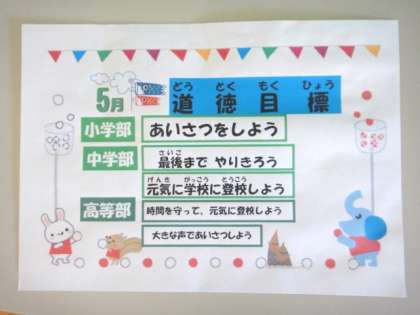 共によりよく生きるために,お互いの生き方や価値観の違いを認め合い,そのよさを伸ばしつつ,共通して守るべきものはしっかり身に付けていくように,本校でも道徳教育を実践しています。公共心や公徳心・生命を尊重する心・感謝する心等の道徳性,自己の生き方についての考えや自覚を深めて自己を生かす能力などが,日常の行動に顕在化するように教育実践するにあたり,毎月の道徳目標を中央廊下に掲示していきます。ご来校の折に気にかけて見て頂けるとありがたいです。