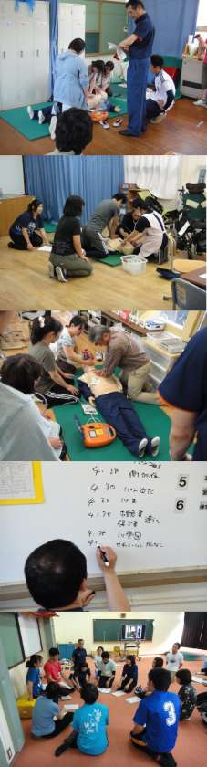 消防署の方に来校頂き,教職員の研修として普通救命講習と緊急時シュミレーションを行いました。まず,多目的室で映像を見ながら救急救命に関する基礎理論や人命救助時の留意事項等について確認しました。その後,小・中・高の3学部に分かれて,給食時に緊急事態が起こったとの想定でシュミレーションをしました。保健室等への連絡,救急車要請,救急車要請から到着までの約8分間の心肺蘇生,他の児童生徒への対応,事態の記録等,実際の事態を想定しているので,皆,真剣です。その後は,各部のまとめの会で情報交換をし,今後のもしもの場合に対して意識を高めました。